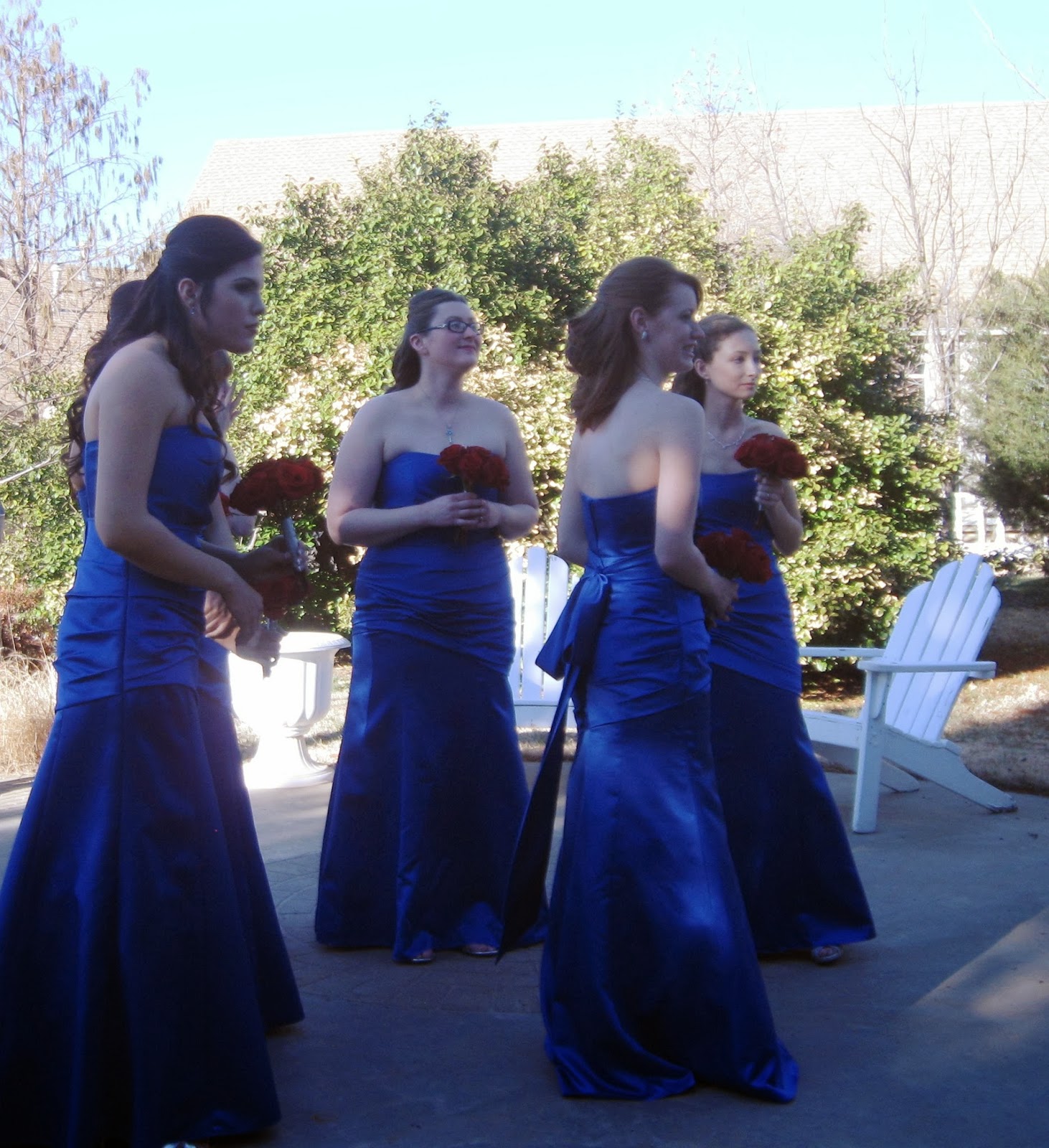 Head Table: Fresh Red Roses - Arrangements with touches of Royal Blue, Purple and Lots of White.