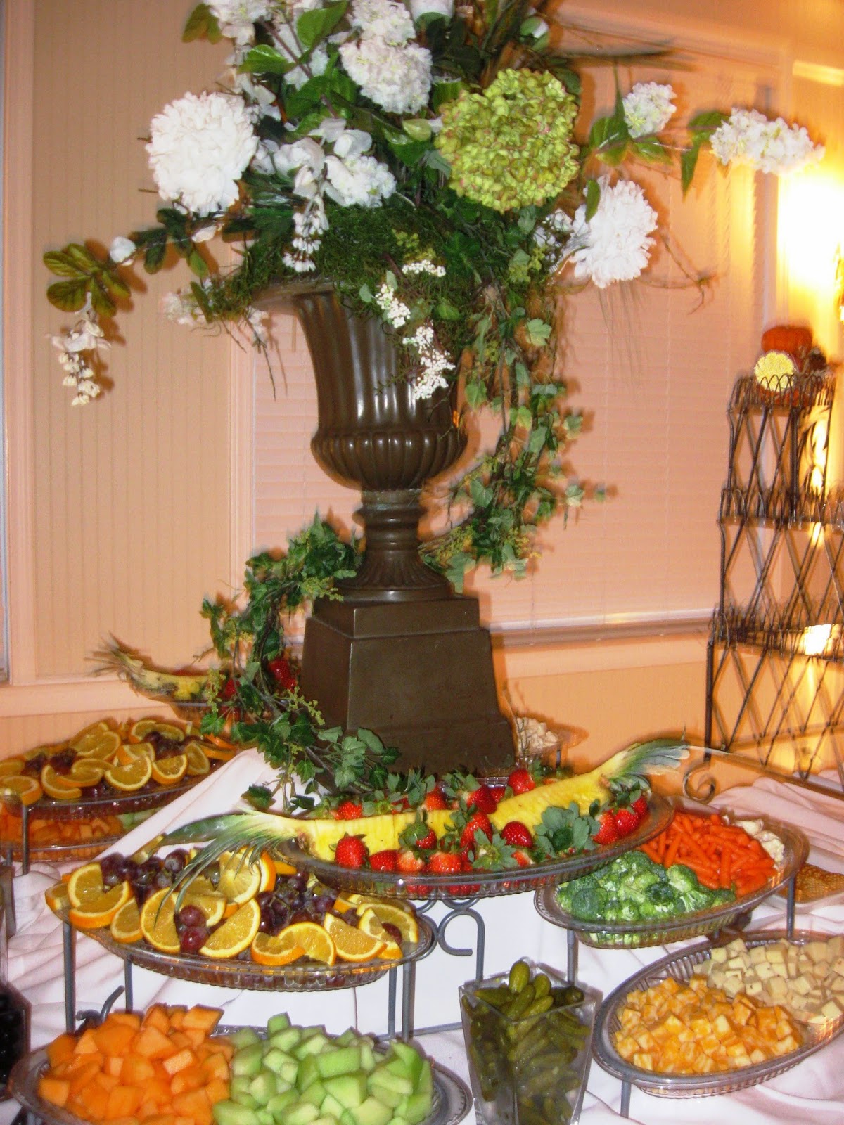 Menu: Fruit w/Fruit Dip, Vegetables w/Ranch Dip, Barbecue Glazed Cocktail Sausages, Boness Buffalo Wings w/Ranch Dressing, Beef Medallions w/Mushrooms, Mini Croissant Sandwiches
